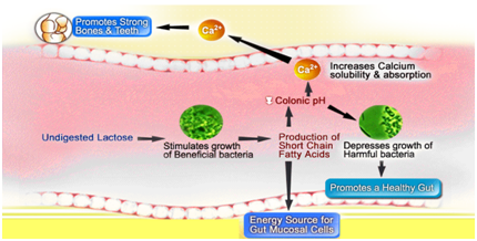 • In normal physiological conditions lactose is hydrolyzed to glucose and galactose by lactase also known as lactase-phlorizin hydrolase, a brush-border membrane-bound enzyme, which is taken up by the intestinal cells and transported into the bloodstream. Lactose which is not hydrolyzed in the small intestine is passed into the colon where it is hydrolyzed by the colonic bacterial enzyme ß-galactosidase resulting in the formation of glucose and galactose. Glucose and galactose are subsequently converted into lactate as well as into the short chain fatty acids (SCFA) acetate, propionate and butyrate. These short chain fatty acids lower the intestinal pH leading to increased mineral absorption of Calcium and Magnesium, hence improves bone mineralization.4