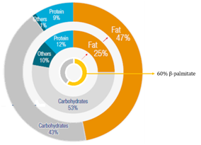 • Palmitic acid, the major saturated fatty acid in human milk, usually represents about 20–25 % of human milk fatty acids. 60% of which is esterified to the sn-2 position in the triacylglycerols (the so-called ß-position).7-9