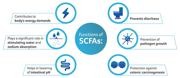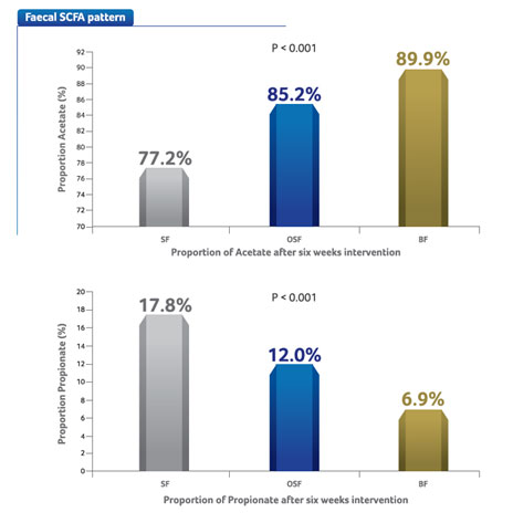 SCFA pattern and its changes are reflective of the bacterial composition of the gut. The faeces of breastfed infants contains mainly acetic and lactic acid with little or no propionic and butyric acid. On the contrary, Faeces of Formula-Fed infants predominantly contain acetic and propionic acid with little amounts of butyric acid.