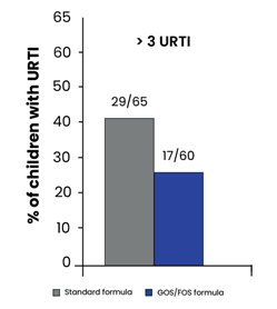 Upper respiratory tract infection: At the end of 12 months, the prebiotic-supplemented group had lower number of infants having more than 3 episodes of URTI (