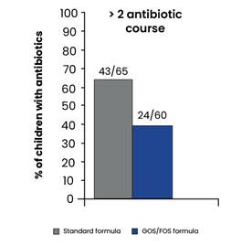 Figure 3: Reduced incidence of antibiotic coverage required in children receiving GOS/FOS enriched formula and in controls. (Adapted from Bruzzese E et al., 2009)
